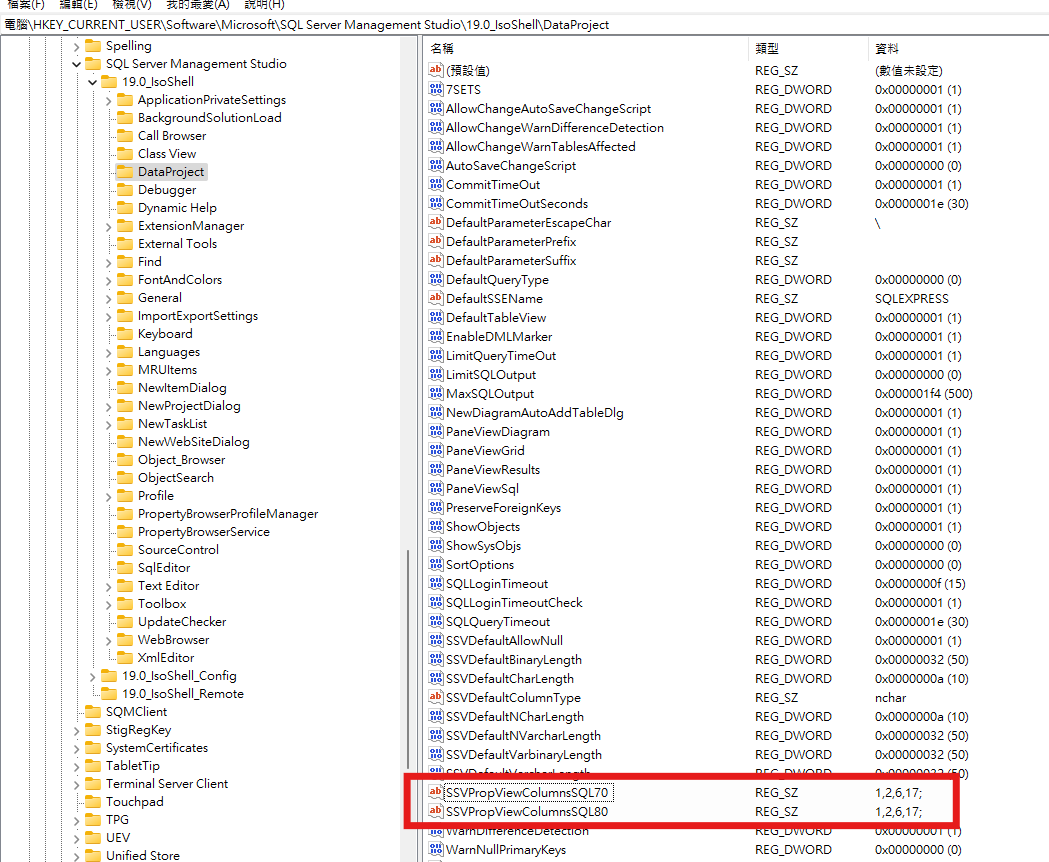 設定 SQL Server 備註 發表於 2024-08-28 分類於 SQL 閱讀次數: Disqus: 設定 SQL Server 的欄位備註顯示 開啟註冊視窗(Windows 鍵+R,輸入 regedit) Computer>HKEY_CURRENTUSER>Software>Microsoft>SQL Server Management Studio>19.0(看個人版本選)>DataProject 編輯以下兩個註冊檔 SSVPropViewColumnsSQL70 SSVPropViewColumnsSQL80 新增 17 重新開啟 SSMS 確認